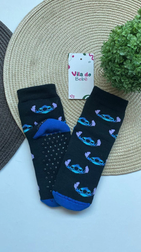 Cansado de escorregar pela casa ou de ver seu pequeno patinando no tapete? A Meia Stitch Preta com Antiderrapante chegou para salvar os passos com muito charme e praticidade!