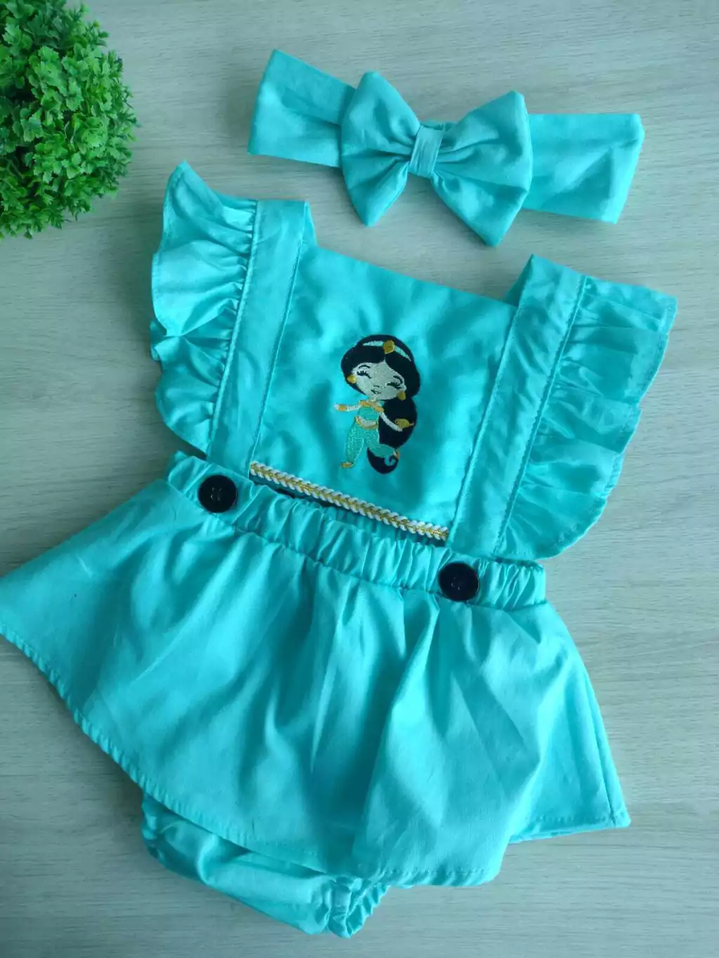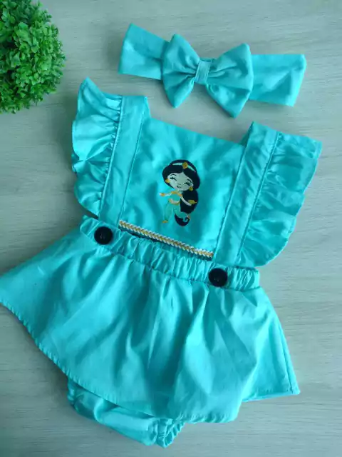 Tecido confortável e macio. Alças reguláveis e elástico na cintura para ajustar no corpo do bebê.